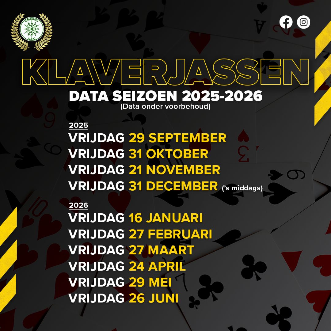 De data van het klaverjas seizoen van 2025-2026 zijn bekend. Zet ze alvast in de agenda. De eerste avond is vrijdag 26 september. Tot dan!👋🏻